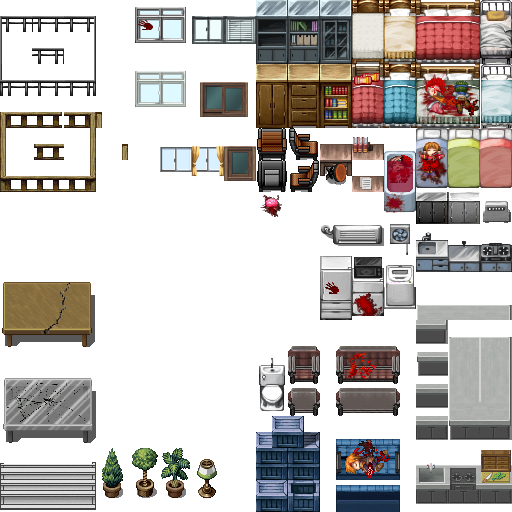 Da ich momentan an einem Projekt arbeite, in welchem am Blut nicht gespart wird, hab ich mich mal hingesetzt und dieses Tileset nach meinen Wünschen gestaltet. Und da es ja irgendwie an allen Ecken und Kanten an Chipsets mangelt, dachte ich mir, ich enthalte es euch nicht vor. Das Chipset passt gut in ein Horrorsetting, oder wenn ihr einen Tatort darstellen wollt. Leider weiss ich absolut nicht mehr, woher ich das Originalset habe, kann daher auch nicht sagen, an wen die Credits gehen. Falls jemand den Autor des Originalfiles zur Hand haben sollte würd ich mich freuen, wenn ich ne kurze Info bekomme. Viel Spaß damit, so long, der Abra